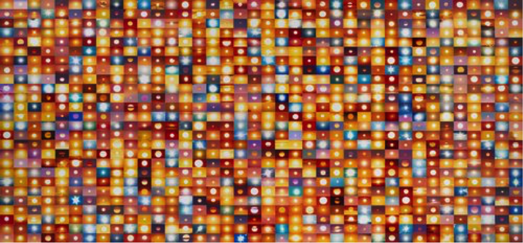 SPHERE founder, Katherine Meadowcroft’s Sri Lankan sunset photo taken looking out over the rooftops of Galle. Everyone around the earth is mesmerized with sunsets as we ponder our passage in time. This is illuminated in the below image by Penelope Umbrico, in 5,377,183 Suns (from sunsets) from Flickr (Partial) 4/28/09. These many sunset photos are taken from people from around the globe and posted to the cyber-universe on Flickr, where the artist appropriated them and created a compilation of universal sunsets.