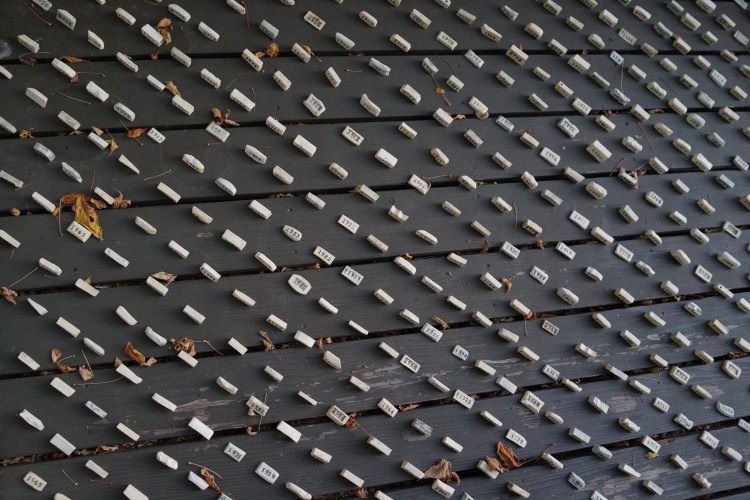 Kaytea Petro wanted to memorialize persons whose deaths were caused by interactions with law enforcement officers. Her Momento Mori, 2014 is a miniature graveyard made of countless rows of more than a thousand small fired clay headstones, each etched simply with the birth year of the person who died in 2014. These rough constellations of years serve as sketchy portraits of decades past with families and communities torn apart by official violence. While not all of the individuals were shot by a police officer, Petro states that the data informing her project also included victims who were tazed to death, struck by police cars, or who died in police custody.