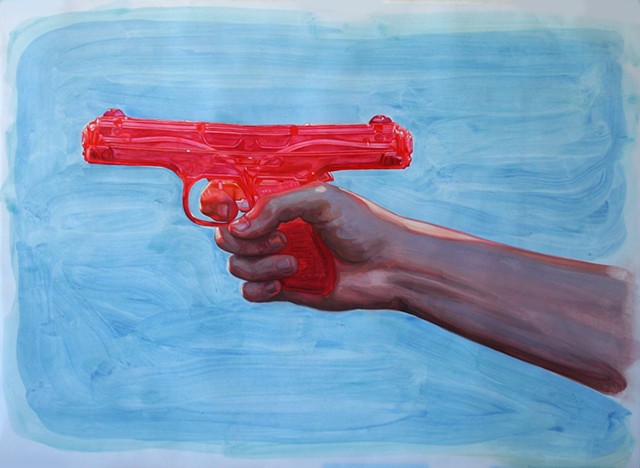 Laura Sander’s work on paper Power Play, a water color painting of a child’s hand aiming a water-pistol at first glance playful, yet the arm and fist symbolize an aggressive gesture with the fleshy tones representing an almost masculine phallic like symbol and not a subtle statement, the double barreled pistol stating that when the shooter shoots the victim he shoots himself, too, whether actually or psychologically.