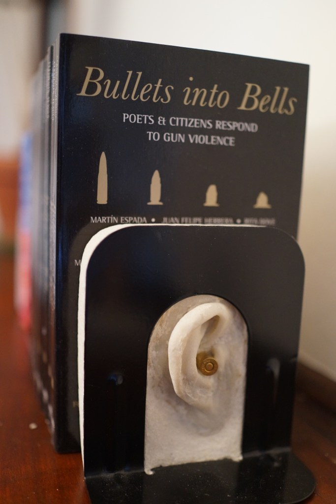 Andrew Ellis Johnson’s sculpture Rehearsal features bookends supporting cast human ears that are plugged by live bullets. Despite evidence from countless studies and statistics, we tolerate a government that behaves like the proverbial three monkeys who see, hear, and speak no evil against the guns associated with so much damage and death.